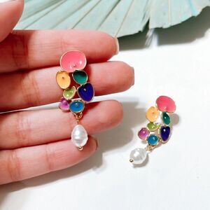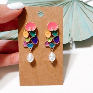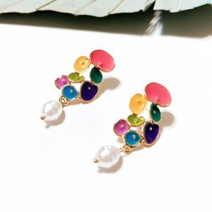 Multicolor flower pearl drop earrings in gold tone