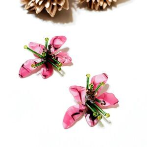 Pink acrylic flower statement earrings in gold tone