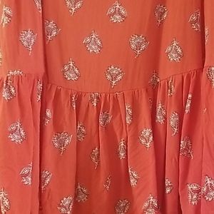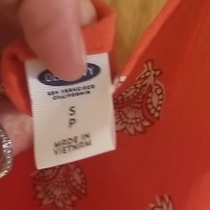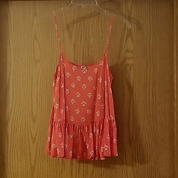 Old Navy orange top with floral like design. This top is so cute on. It has adjustable spaghetti straps an a slight hi-low hem.