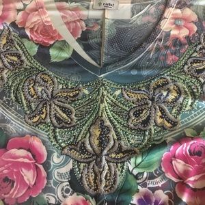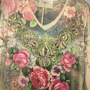 Flowing dress out of Jersey with irregular hem longer on the sides and rhinestone colored front appliqué