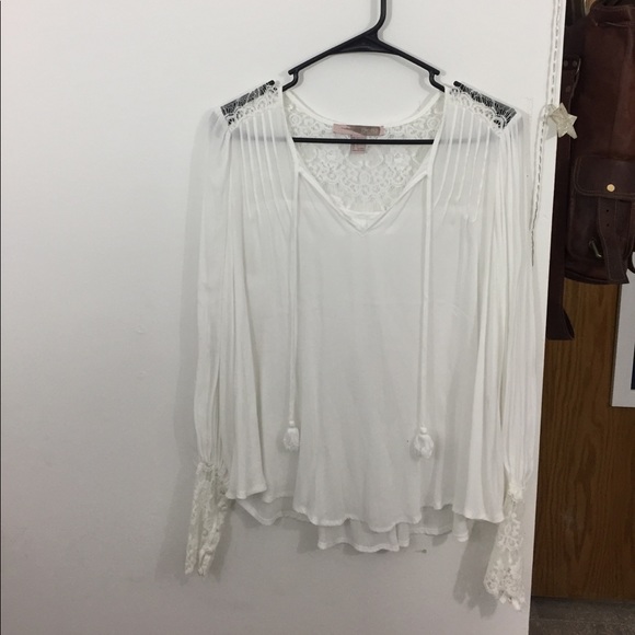 A nice light weight spring time blouse with lace detailing on the wrists and back.