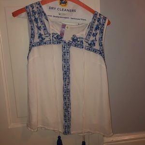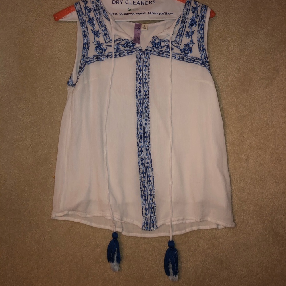 Blue embroidery with flowers and white flowy material