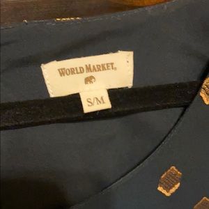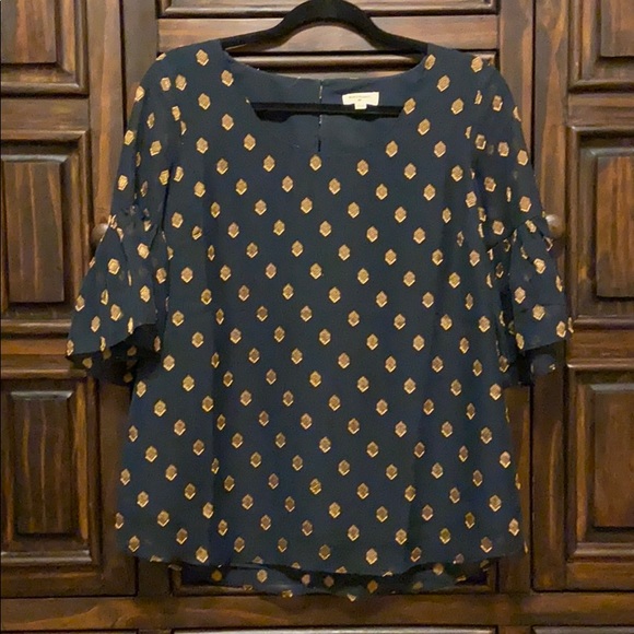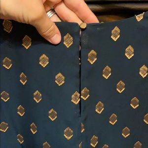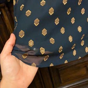 Navy blue with gold pattern flowy short sleeve blouse. Lined, keyhole back. Approx 19” armpit to armpit and 25” shoulder to hem. Smoke free home.