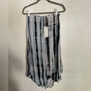 Stylish midi skirt with a tie-dye pattern. Features black and gray tones. Perfect for casual wear.
