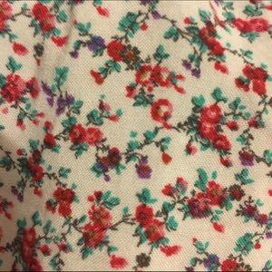 Elastic waist skirt with purple, red, and teal floral pattern.