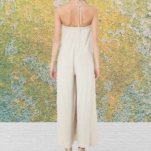 Super comfortable and flowing, this halter knit jumpsuit is oatmeal in color and made of 96% Rayon and 4% Spandex. Open mid-back design with halter tie. Classic chic!