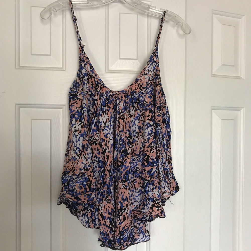 Blue, black, pink and white multi-colored tank top! Very flowy and flattering on any body type. Goes up higher on the sides and comes to a flattering rounded point in the back and front.