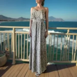 🤎 Lovely natural colors mix of beige, brown, and sage 🤎 flowy and soft 🤎 zipper on the side 🤎 lined 🤎 adjustable straps 🤎 length about 56in from strap 🤎 size S 🤎 model wears S 🤎 like new