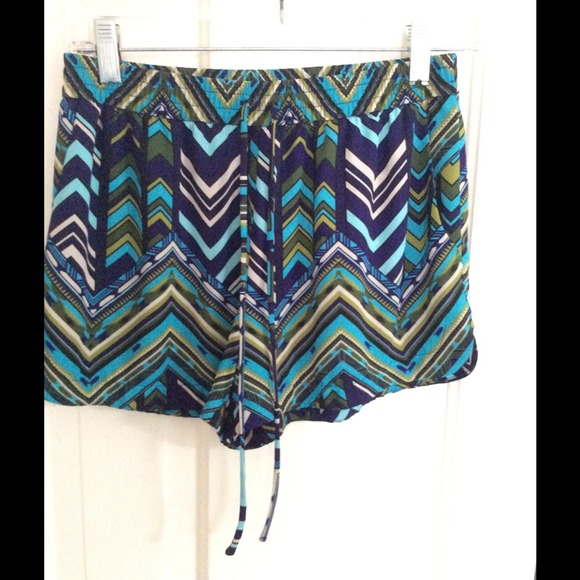 blue, green, and navy chevron patterned, never worn, stretchy waist, strings in front to tie