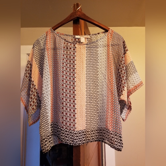 Cute, multi pattern top. Thin and breezy, would wear with a tank or bralette underneath. Colors are brown, black, orange, turquoise blue, white.