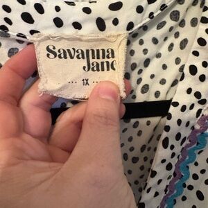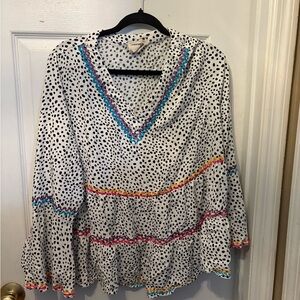 This stylish flowy blouse features a playful polka dot pattern with vibrant trim. Perfect for adding a pop of color to your wardrobe.