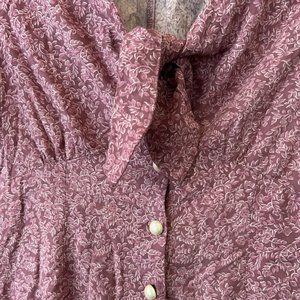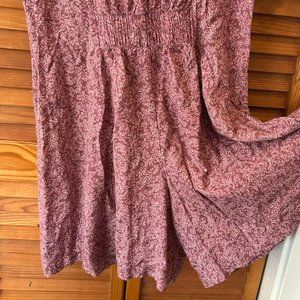 Flowy floral romper. Buttons down, elastic ruching in the back, and a front tie feature.