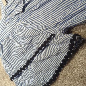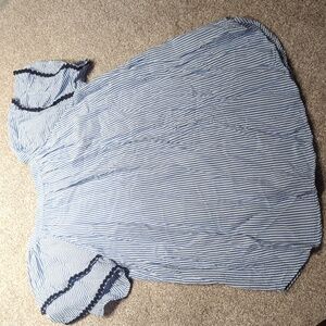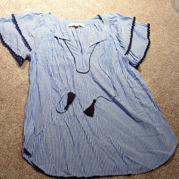 Cute, pinstripe flowy top from LOFT. Ruffled sleeve design with v-neckline and tassel detailing. Material is very soft and the waistline is very flattering. Perfect for layering and the summer. No damages, stains or tears. Pet and smoke free as well. All offers welcome!!