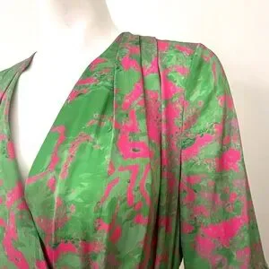 Color/Pattern: The fabric is a flowy material with an abstract, swirling pattern in bright lime green and hot pink hues. Size S will also fit a M