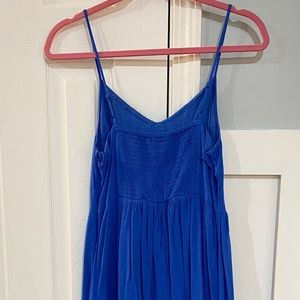 Super fun and gorgeous blue sleeveless dress with an eyelet detail top and shoulder straps. I'm 5'2" and it fits like a midi dress. The skirt part is definitely a full skirt, has a liner, and cute eyelet cutout details on the bottom trim. No zipper.