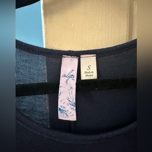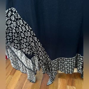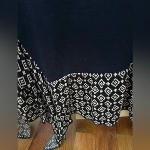 Navy Sweater with black and white detailed bottom hem. Bottom of the top is flowy and the sides come lower than the front and back. Light weight airy sweater.