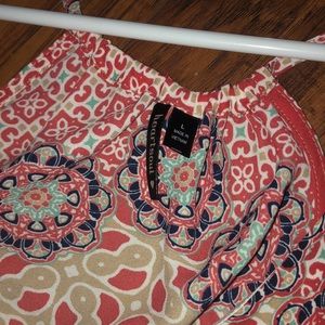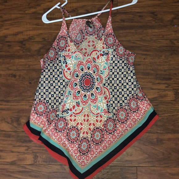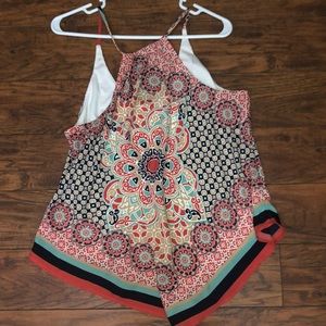 This multicolored top is perfect for the spring and summer. Hardly ever worn, good condition. Has colors of red, teal/blue, navy, tan and white. Very flattering. Has an underneath white tank so it’s not see through!