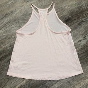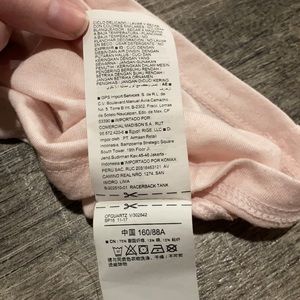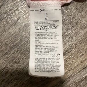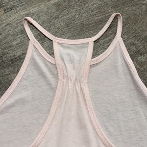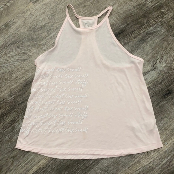 Pink flowy tank top. Spaghetti strap style with scrunch detail on the back. The fabric is very soft, somewhat see-through. The text repeats “don’t sweat the small stuff” in white cursive on the right side. Great for casual or active wear! Like new! No cracking is apparent in the text.