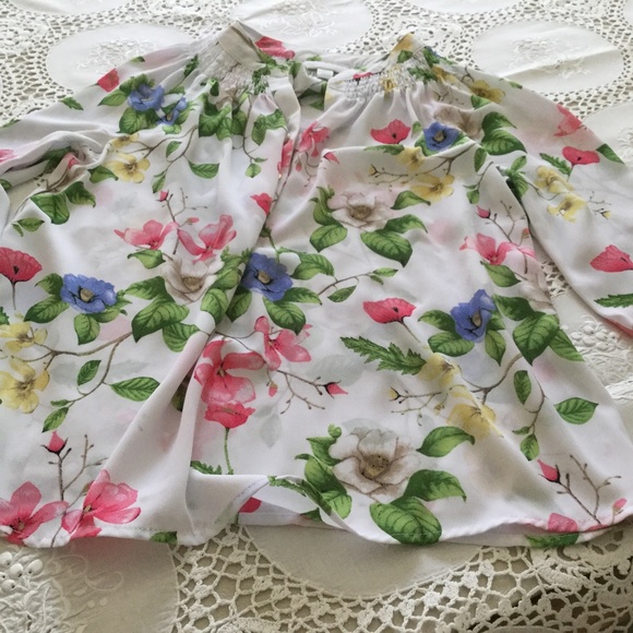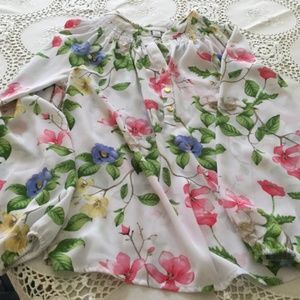 Flower pattern with elasticized cuffs. Gold buttons at the neckline.