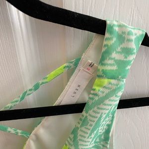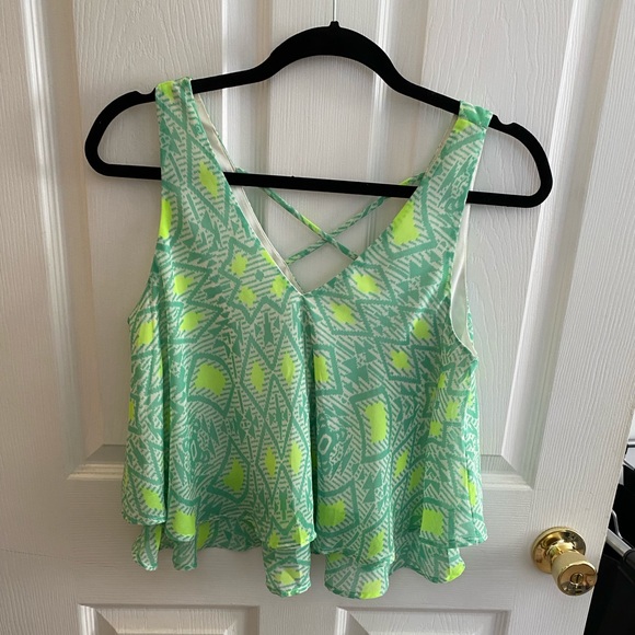 Flowy Tank Top with criss-cross detail on the back. Pattern is watercolor/Aztec. Has two ruffled layers.