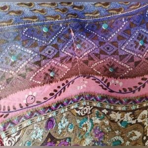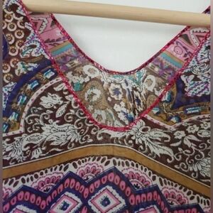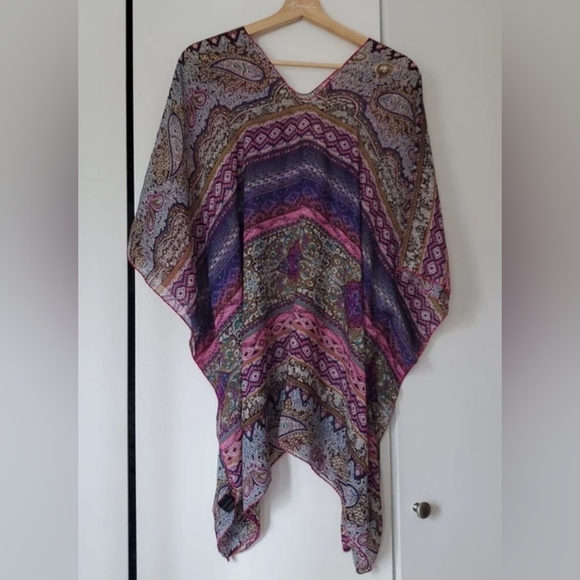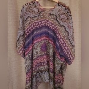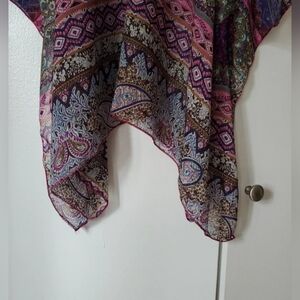 Purchased at a boutique in Sedona AZ. One size, completely sheer. All pictures in daylight minus last one (night, room lighting). Picture 4 shows the threading on an arm/sleeve. I'm 5'3 and arm length hits about the elbow and below butt at the bottom. Is longer in length on the sides ( at the bottom).