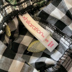 Black and white plaid, embroidered lemons; flowy, resembles a skirt