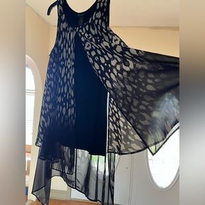 Flowy black and white print top with black tank underneath. The tank gives it a comfortable fit while the print in the outside gives it a classy touch! This is in a non-smoking home.