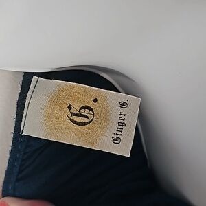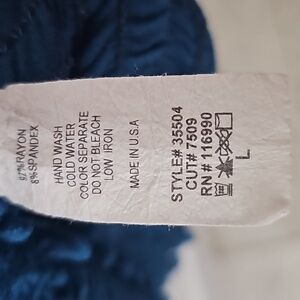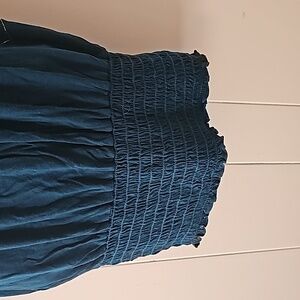 Dressy/flowy blue top with a design on the left breast/arm. Silvery accent Cinched stretchy large waistband Gently used