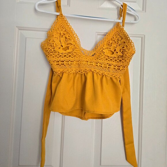 Bohemian lace crop top with spaghetti straps and ties in the back. Brand new