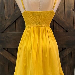 Flowy mustard color short dress. Double layer fabric. Perfect to wear with sandals or cowgirl boots. Adjustable straps. Stretchy material on back.