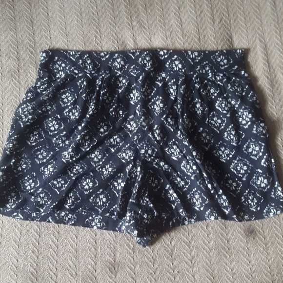 Rayon black and ivory flowy shorts. Fits like a 10. It has pockets! Not enough for a phone but enough space for keys or rocks or a hotwheels car. True story.