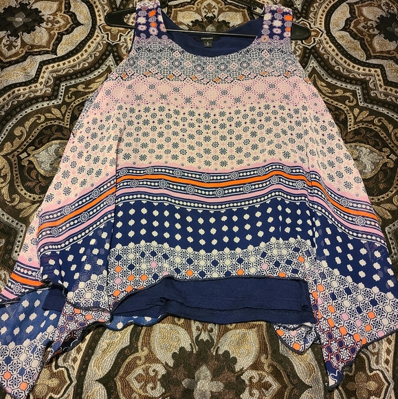 Super cute and comfy, flowy, sleevless top. Patterned fabric is sheer and light and undershirt lining is soft and stretchy. Size S but could easily fit a M