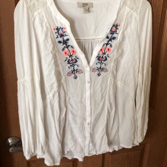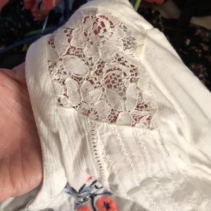 White tunic w lace on shoulder and embroidered trim on front. Button down w detailed sleeves Very soft