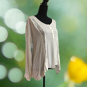Stick close to the sunset path and your style will never be steered wrong. This chic bohemian top features a flowing silhouette, eyelet piecing at the front and back, and cute long sleeves with rolled cuffs.