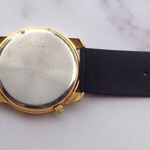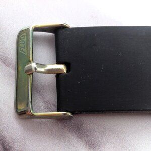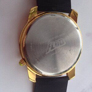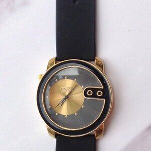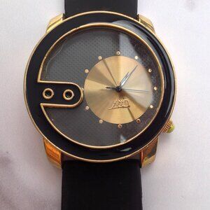 This watch from FLUD is an awesome piece with special significance to those what love the sight of a record on a turntable.  This watch is a depiction of a gold record spinning on a black turntable.  The gold record forms the heart of the watch face with gold dots to denote the numbers of the watch face.  there id a bold black enameled rim encircling the turntable in decoration further depicting a turntable arm reaching for the record.  .  It is a big bold face watch.  Close examination of the record reveals little black grooves to depict the vinyl feel.  The watch has a nice green cabochon atop the crown.  The band of this watch is a black silicone of sweet quality.  Quartz movement.  Excellent condition. Measurements provided in the listing photos.   Ready to wear.