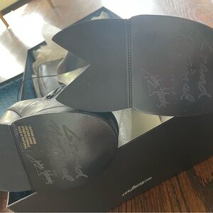 The real deal - black Grand National boots. Worn for two hours on carpet. These are a size 9 and are best for someone who wears an 8 in Fluevogs. I didn’t listen to the advice and bought my usual size. I’m now much happier in a larger one. No marks or scuffs. Non-smoking home. There are dogs but they have not worn the boots. Box and bag included.