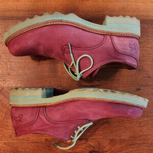 These beautiful burgundy nubuck loafers have contrasting teal laces and soles, for a fun pop of color! You will get many compliments. These have had very little wear and are in excellent condition. This is a very comfortable style too!