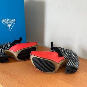 Fluevog Prepare Pledge - tomato red orange w xo b&w accent, ribbon tie - 9.5