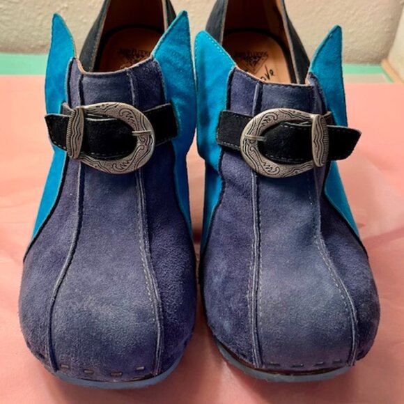 Gently worn Fluevog Summer of Love heels. These are a big 9.5 so they aren't good for narrow feet. I usually wear from a 10-11 and these fit me fine. I've worn them several times so there are some scuffs I tried to highlight. In original box with shoe bag.