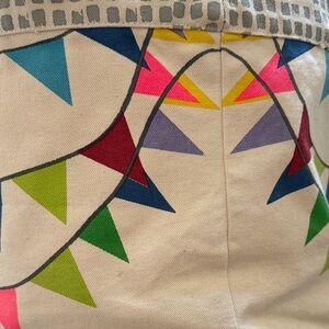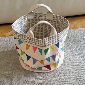 Vibrant storage basket with multicolor triangles. Ideal for organizing toys. Durable and fun design.