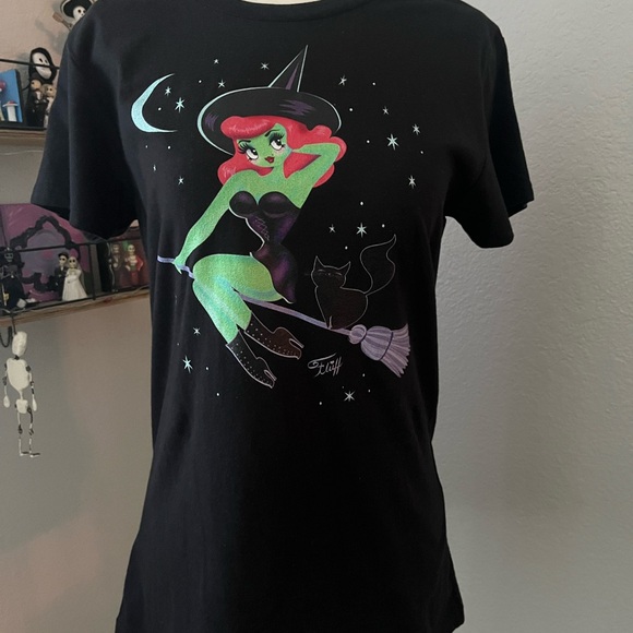 Short sleeve black tee. Features a witch on a broomstick. Vibrant design with green, purple, and red accents. New. Never worn.