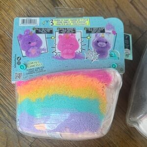 Adorable Fluffie Stuffiez plush set featuring a rainbow pouch and a silver bunny. Perfect for collectors and kids.
