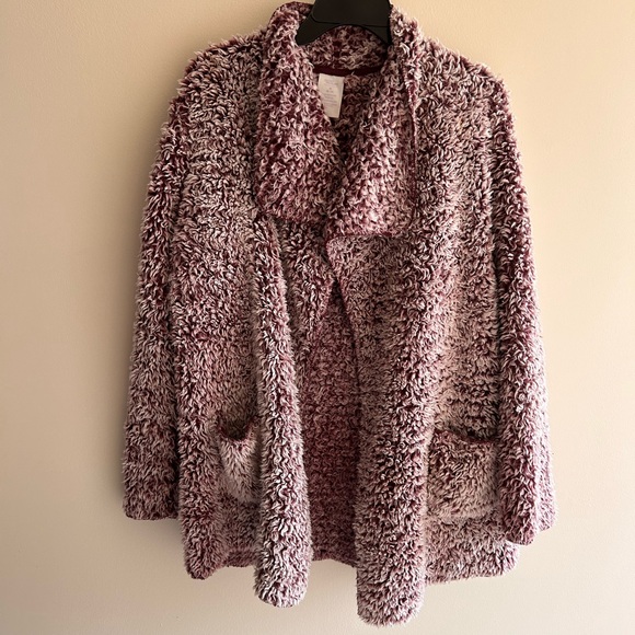 Fluffy jacket with front pockets and pretty neckline. Ideal for cold winter in front of fire. Very pretty for Christmas holiday