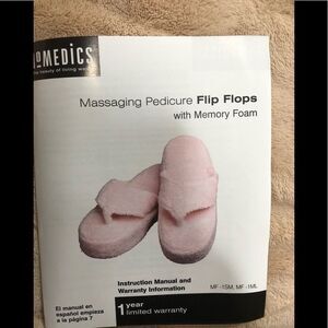 New in the box massage pedicure flip flops with memory foam. I got them as a gift but they are to small. I wear a size 81/2. Small medium would fit 6/81/2 according to the box but they are a little small for me . They have a battery operated massage feature. I just put the batteries in to see if it works. It’s a nice feature to ease tension in your feet, arched and calves. The right one seams a little stronger vibrating than the left maybe the batteries need to be replaced.