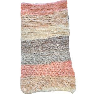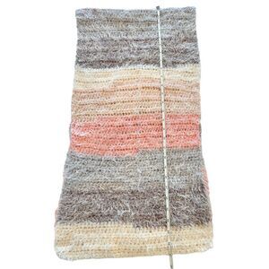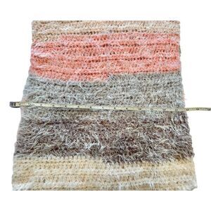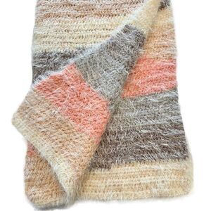 Soft and fluffy winter scarf in pastel bands of color- Pinks, purple, gay and white. Length: 54” long, 14” wide No brand or content tags, but believe the knit fabric to be fluffy acrylic with a “mohair” halo.