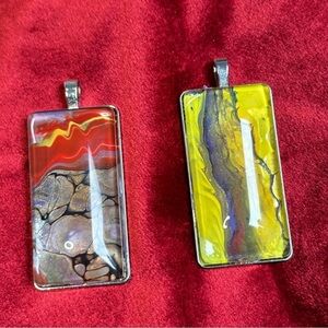 These hand-painted acrylic pendants feature unique and original artwork under rectangular glass cabochons. Each pendant showcases various FLUID ART ABSTRACT ORGANIC MOVEMENTS