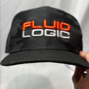 Brand new Fluid Logic racing cap hat with orange and silver embroidered logo on front. Hat is black with find camo detail, adjustable, made by new era cap Company, button top, one size fits most, 100% polyester.