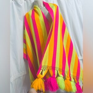 Brighten up any outfit with this vibrant fluorescent scarf and shawl wrap. Made from a soft cotton blend, it features playful fringe and decorative balls, perfect for any season. Ideal for adding a pop of color and texture to your look.