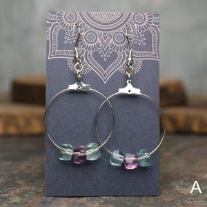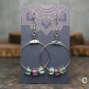 These handmade Silver Hoop Earrings have three natural 7 mm Faceted Rainbow Fluorite Rondelle Beads, hanging on each Hoop. These Earrings come carded with Stainless Steel Ear Wires and Silicone push backs.
