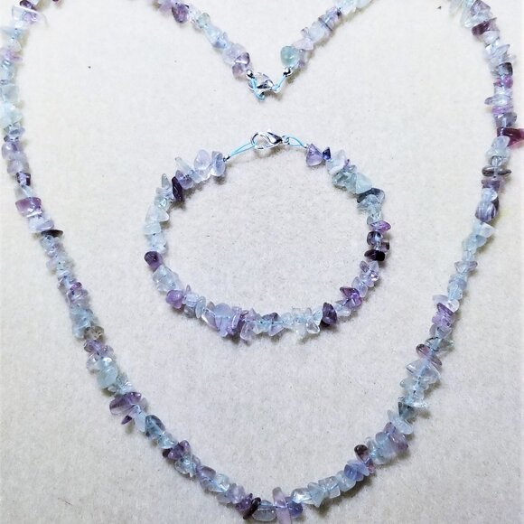 This gorgeous set is made with Rainbow Fluorite chips. The bracelet and necklace are strung with Soft Flex Turquoise colored wire. The both have a lobster clasp close and measure; Necklace – 20”, Bracelet – 7 ½”.